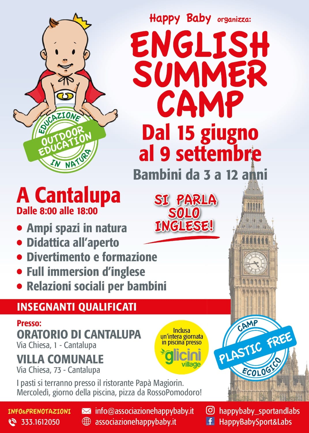 Da metà giugno fino alla prima settimana di settembre, per 13 settimane estive, adatto ai bambini dai 3 anni ai 12 anni, dalle 08:00 alle 18:00 i bimbi saranno completamente assorbiti nella lingua inglese, una vera e propria full immersion in una nuova lingua con un metodo coinvolgente e divertente, giochi, attività in natura, teatro, passeggiate nei boschi, attività di orientamento, caccia al tesoro, pulizia di ambienti naturali ed altro ancora.