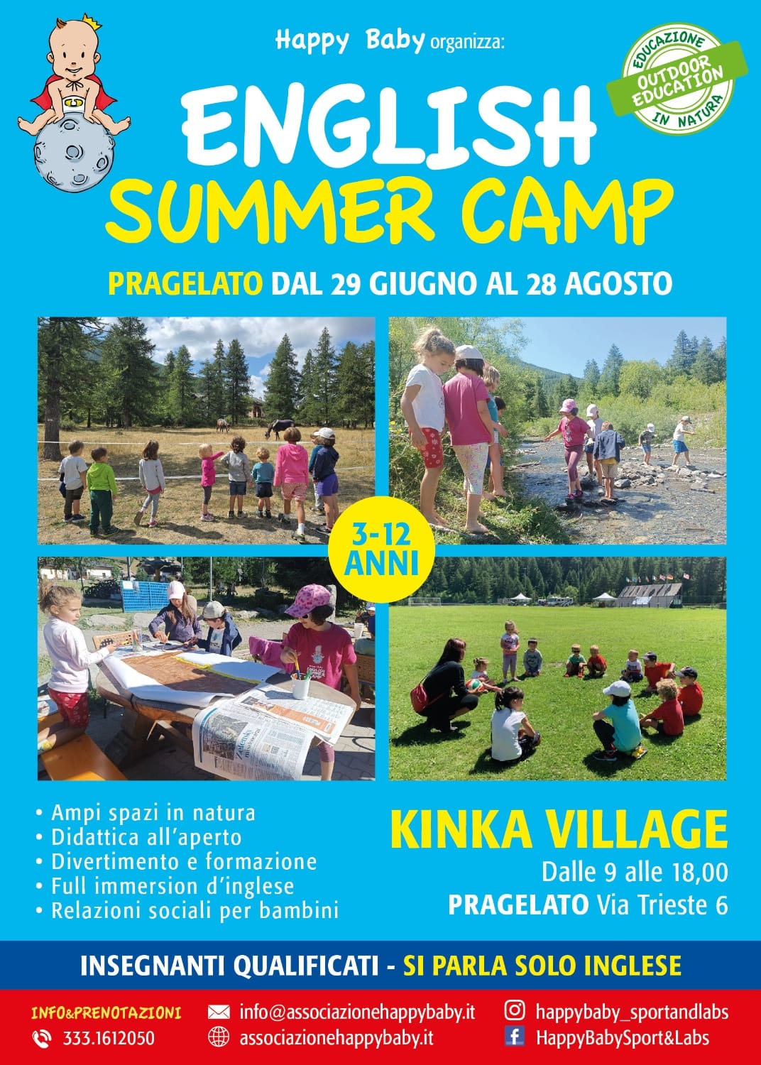 Da fine giugno fino all’ultima settimana di agosto, per nove settimane estive, adatto ai bambini dai 3 anni ai 11 anni dalle 08:00 alle 18:00 i bimbi saranno completamente assorbiti nella lingua inglese, una vera e propria full immersion di natura, sport e inglese, con un metodo coinvolgente e divertente, giochi, attività all’aria aperta, passeggiate, e tanti tuffi in piscina. Saremo nella meravigliosa location Kinka Village di Pragelato, immersi negli stupendi paesaggi montani.